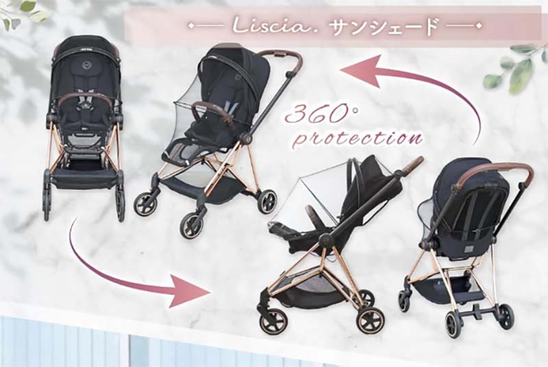 Lisciaの蚊帳は、ベビーカー全体を360度すっぽりと覆うタイプです。 フルカラーの説明書と収納袋が付いているので、初めてでも迷わず取り付けられます。